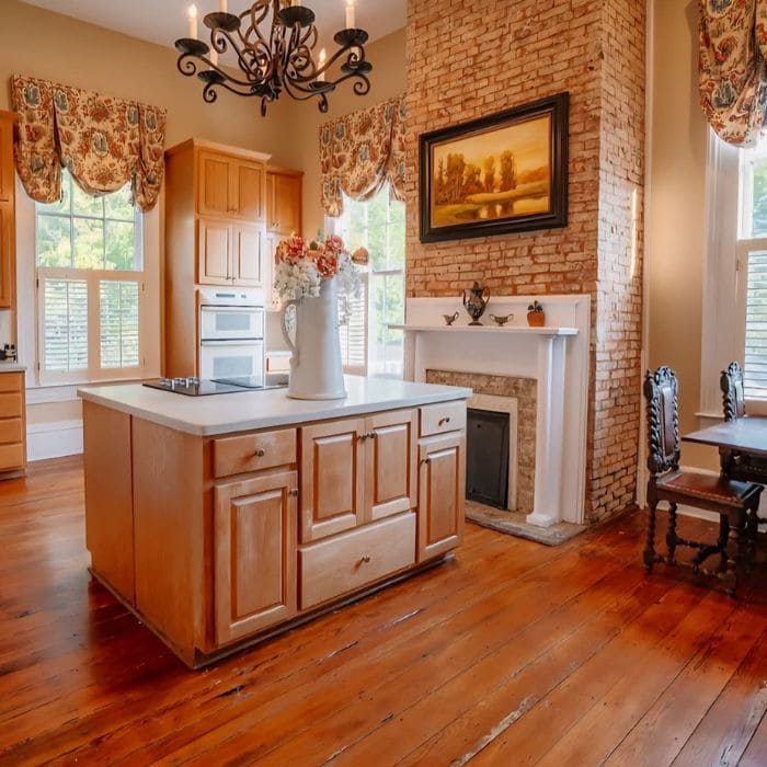 In the kitchen, the warm wood cabinets and simple island made the space feel open and practical. The brick fireplace added a sense of warmth that balanced the room, making it feel like the heart of the house rather than just a place to prepare food.