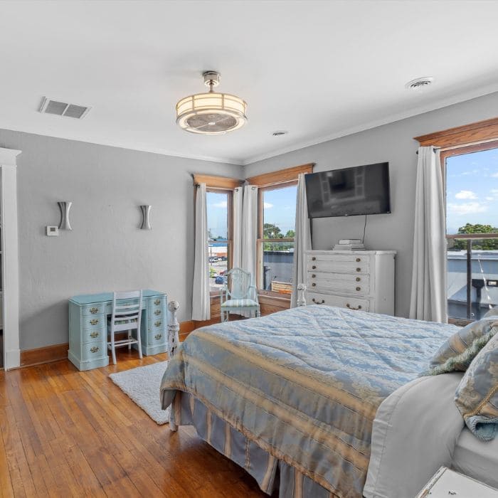 Our bedroom upstairs felt fresh and peaceful with gray walls and soft blue bedding that echoed the tones of the ocean nearby. Large windows framed little slices of Tybee life with rooftops, sky, and hints of water in the distance.
