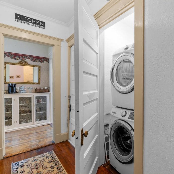 A compact laundry closet sat near the kitchen, tucked neatly behind a paneled door. It wasn’t glamorous, but it was practical, and during a beach vacation, practical things become life-savers, especially when everything is sandy and sun-soaked.