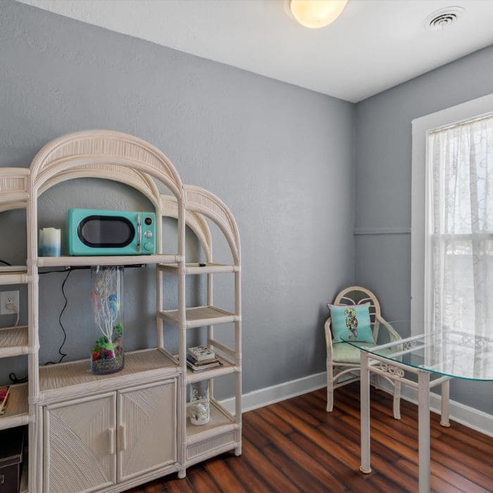 There was even a little retro-style turquoise microwave on the shelves, which made the room feel charmingly quirky. These unexpected touches were everywhere in the house, and each one added a layer of personality.
