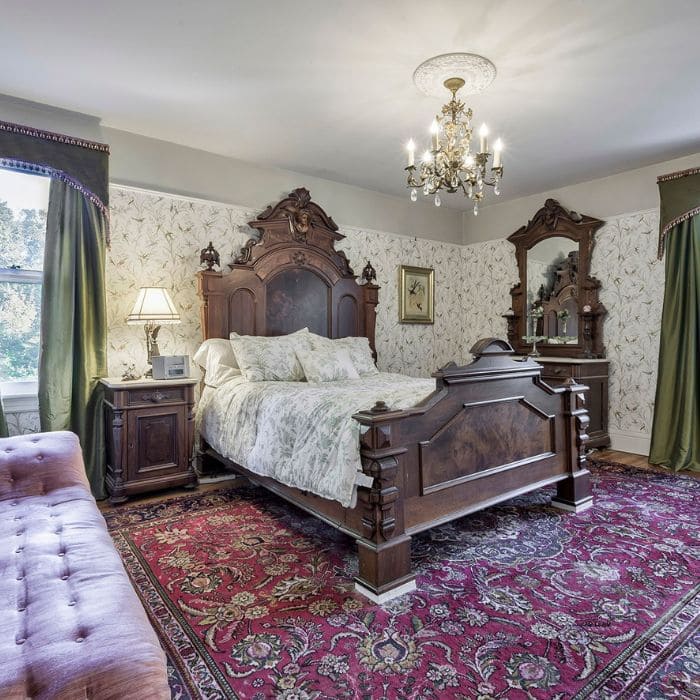 Victorian bedrooms were lush, often decorated with rich fabrics and heavy furniture. This room, with its grand carved bed frame, velvet drapes, floral wallpaper, and ruby-tone rug, captures that history.