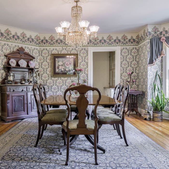 The dining room took my breath away with its layered wallpaper – delicate, romantic, and distinctly Victorian. Wallpaper during this time often mixed multiple patterns in one room, with borders, panels, and repeating motifs meant to create visual abundance.