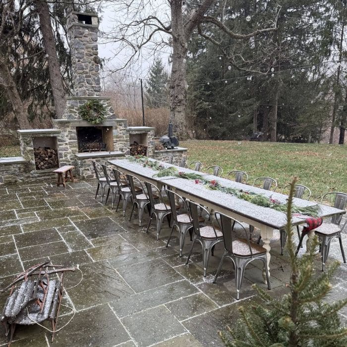 Before the snow came down too hard, I stepped outside for a moment. The long outdoor table was meant for our dinner, but the weather changed that plan. Still, even covered in a thin layer of snow, it looked magical.