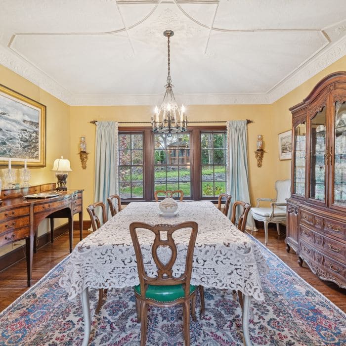 The rug extended about 60 centimeters beyond the table edges, something Mrs. Smith said she learned after years of chairs catching on rug corners.