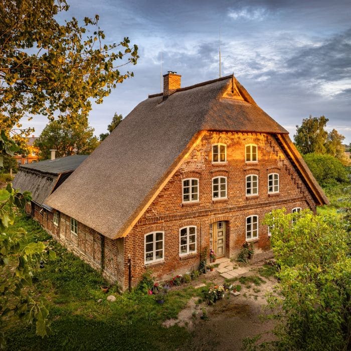 The brick face glowed warmly under the soft Savannah sun, and the steep thatched roof looked almost like a woven blanket pulled tight around the home. The air smelled faintly of earth, hay, and something woody.