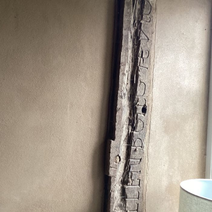 One wall beam, worn and split from age, carried hand-carved letters and marks, likely initials and dates carved by former owners. Kenny said some of the carvings resembled 17th-century tally marks, which people used to record harvest quantities or building repairs.