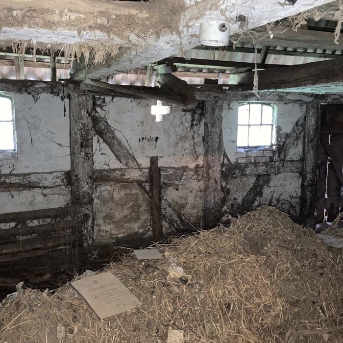 We stepped into what used to be the barn area, where wooden posts darkened with age held up the roof. Straw still covered parts of the floor, along with crumbling pieces of clay and lathe.