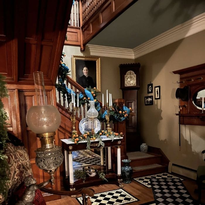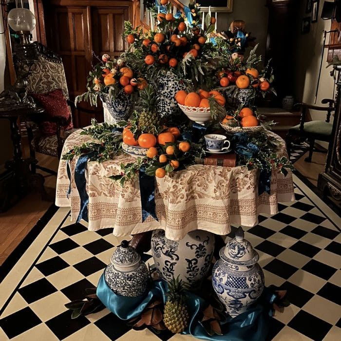 Right there in her living room was a table overflowing with oranges, greenery, blue ribbons, porcelain vases, and the soft glow of candlelight. It looked old-fashioned in the most charming way, almost like a scene from a historic home tour, yet it felt fresh and playful.