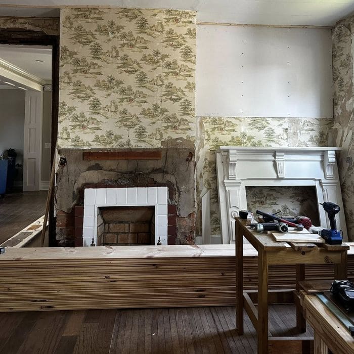 We measured everything carefully because we wanted the new mantel to honor the shape of the old one while giving the room the stability it never had.
