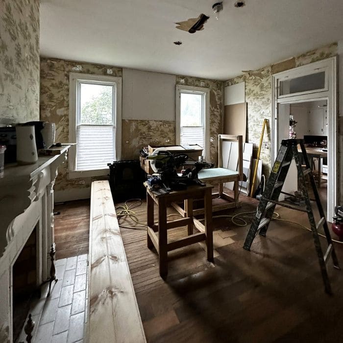We had always joked that this wallpaper might outlive us, but the moment we removed the mantel, we saw how brittle it had become. The top half still looked soft and charming, but the bottom half was peeling, cracking, and missing entire sections.