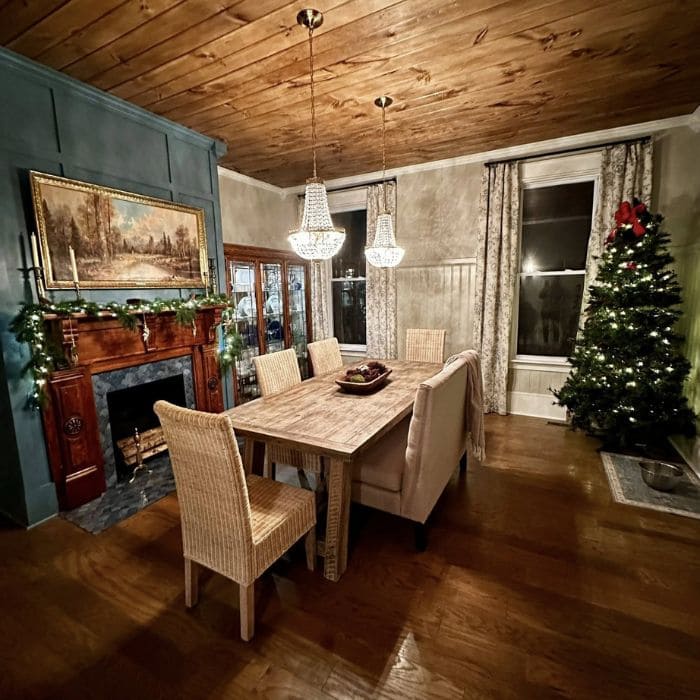 We walked in and saw the table almost immediately. Long, solid wood, beautiful grain pattern, and a warm tone that blended perfectly with the mantel and ceiling.