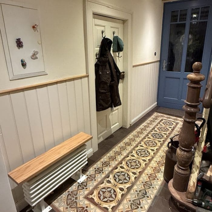 We dry-laid the tiles first, without glue, just to plan the pattern. Because the hallway is narrow, we centered the main motif and let the border tiles run along both sides.