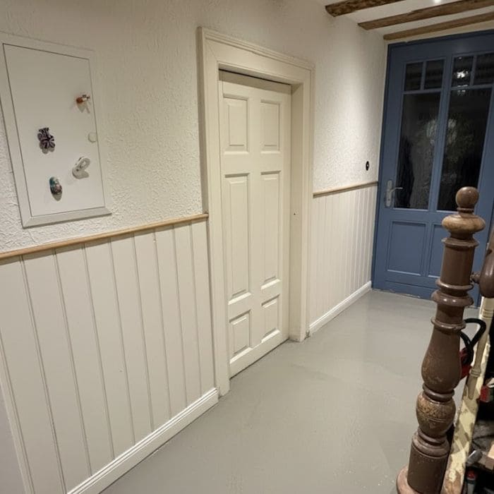 This part is not visible once finished, but it matters the most. The hallway floor now has a cement leveling layer of about 2-3 cm, ensuring the old tiles sit flat and don’t crack over time.