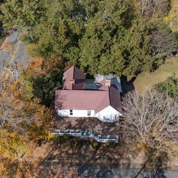 The wraparound porch curves gently around the exterior like a warm embrace, and from the drone photos we could see how the deep red roof peeked between tree canopies like a secret waiting to be told.